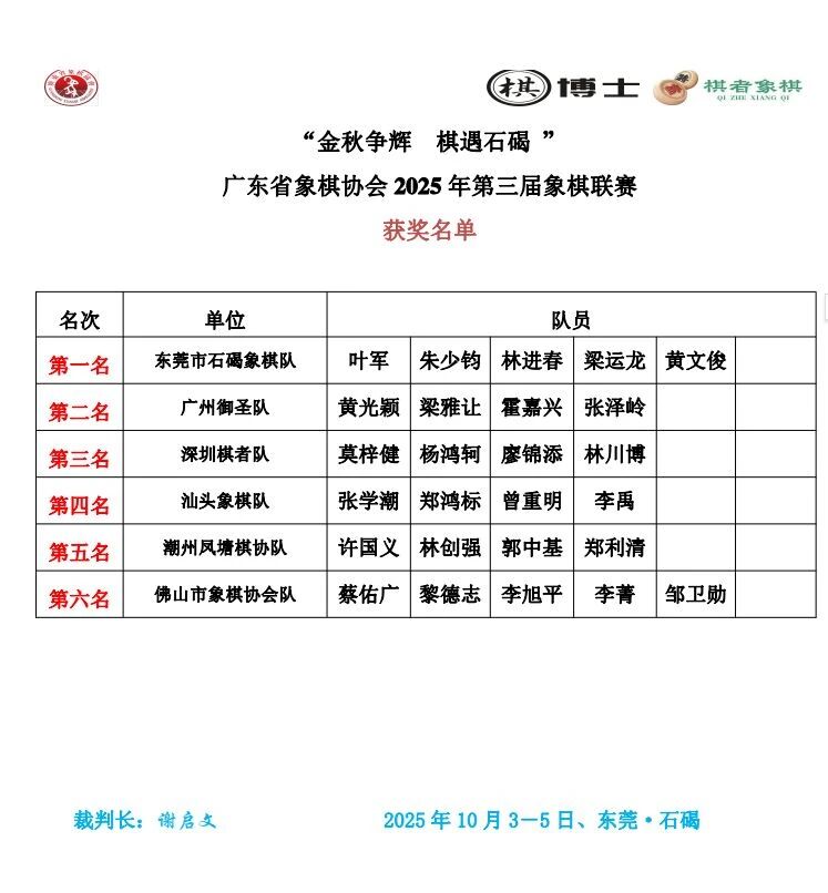 10月5日广东省象棋协会2025年第三届广东省象棋联赛十一轮战罢,东道主东莞石碣队以8胜3平积19分不败战绩捧起冠军奖杯,获5万元大奖。广州御圣队、深圳棋者队分列第二、三名,获奖分别为3万元、2万元。个人射手榜,御圣队黄光颖大师11轮得20分,胜率90.91%,完美登顶。