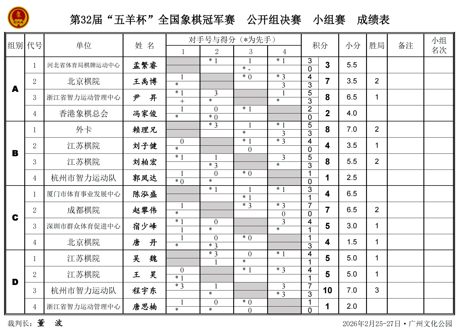 A组,王禹博“双杀”香港棋手冯家俊,豪取两连胜止住颓势;尹昇和孟繁睿首次对阵言和,晚间的第四轮比赛孟繁睿因迟到被判弃权,尹昇不战而胜。四轮战罢,尹昇以8分领跑“死亡之组”,王禹博以7分居后,孟繁睿四战仅获3平1负,出线形势岌岌可危。